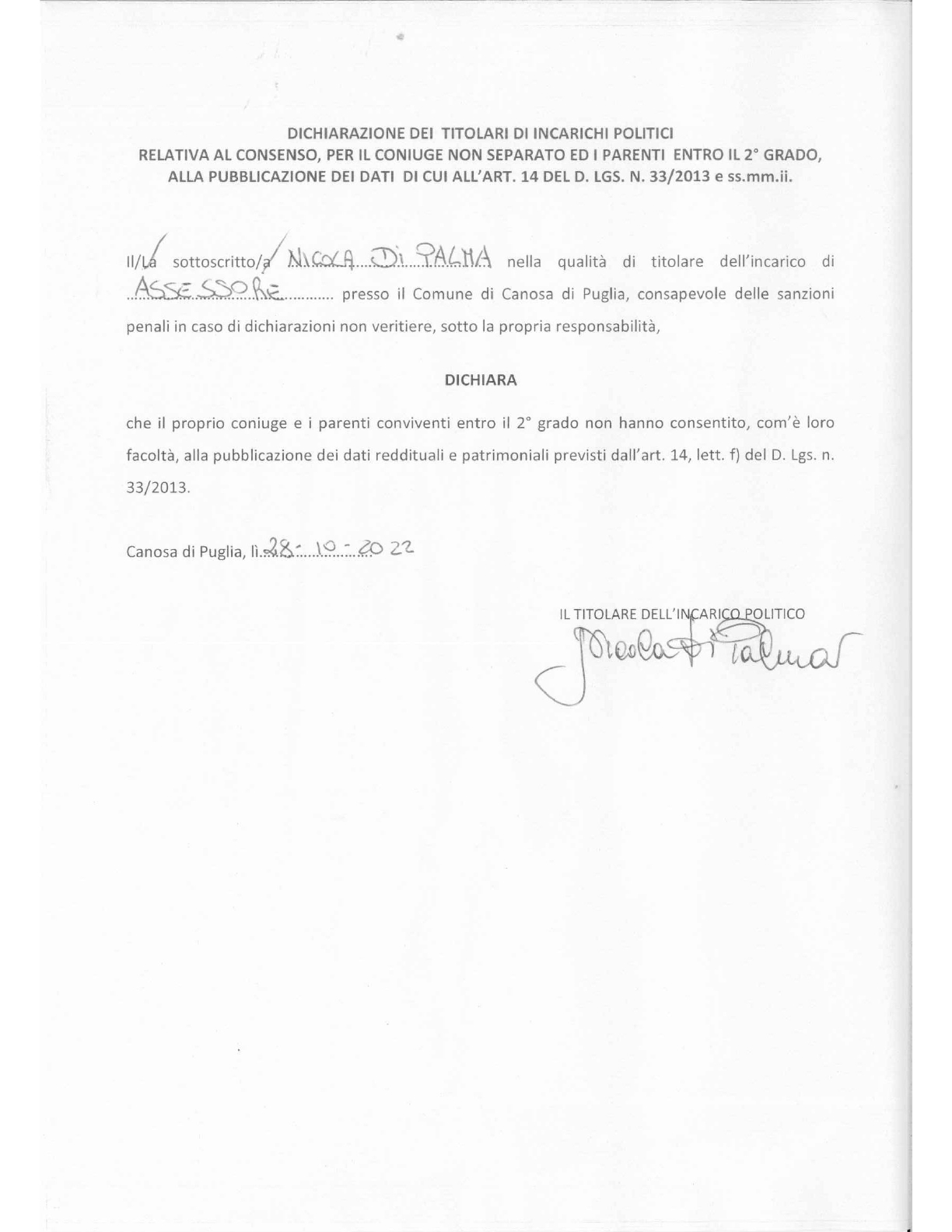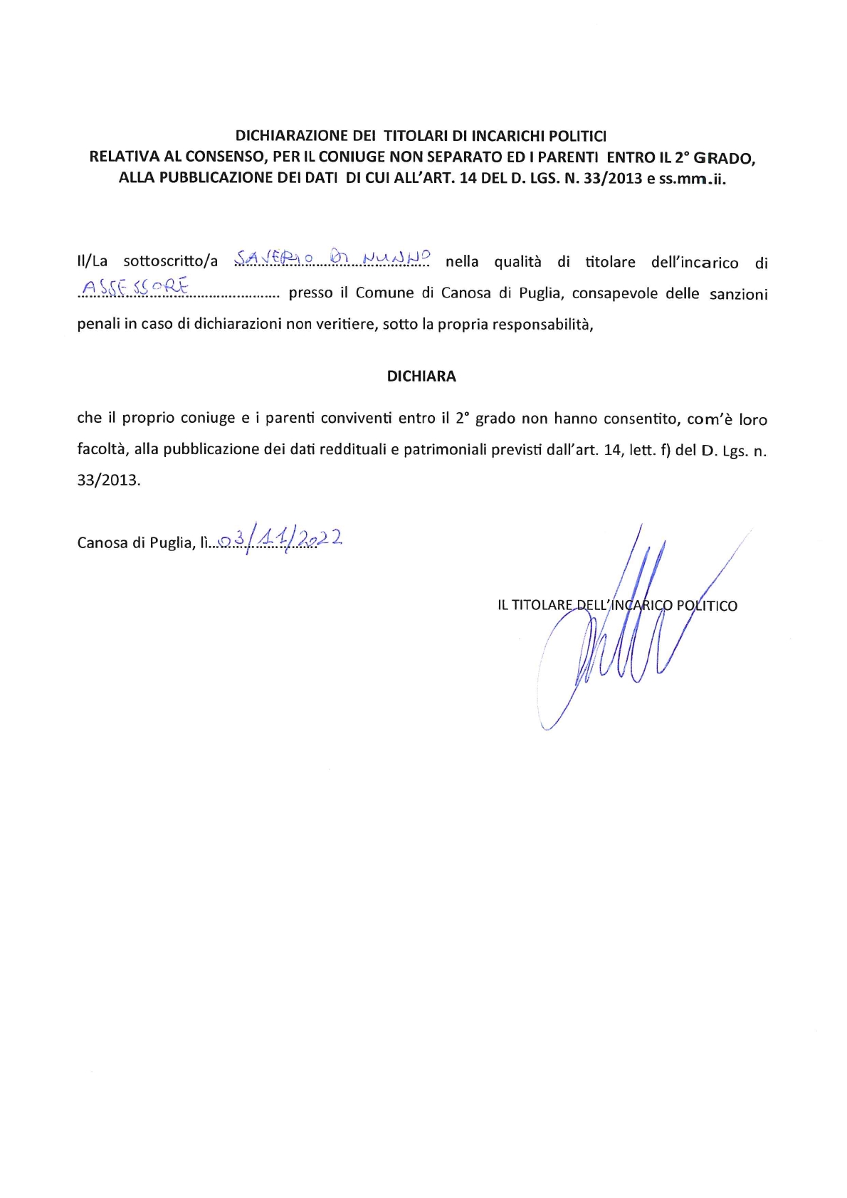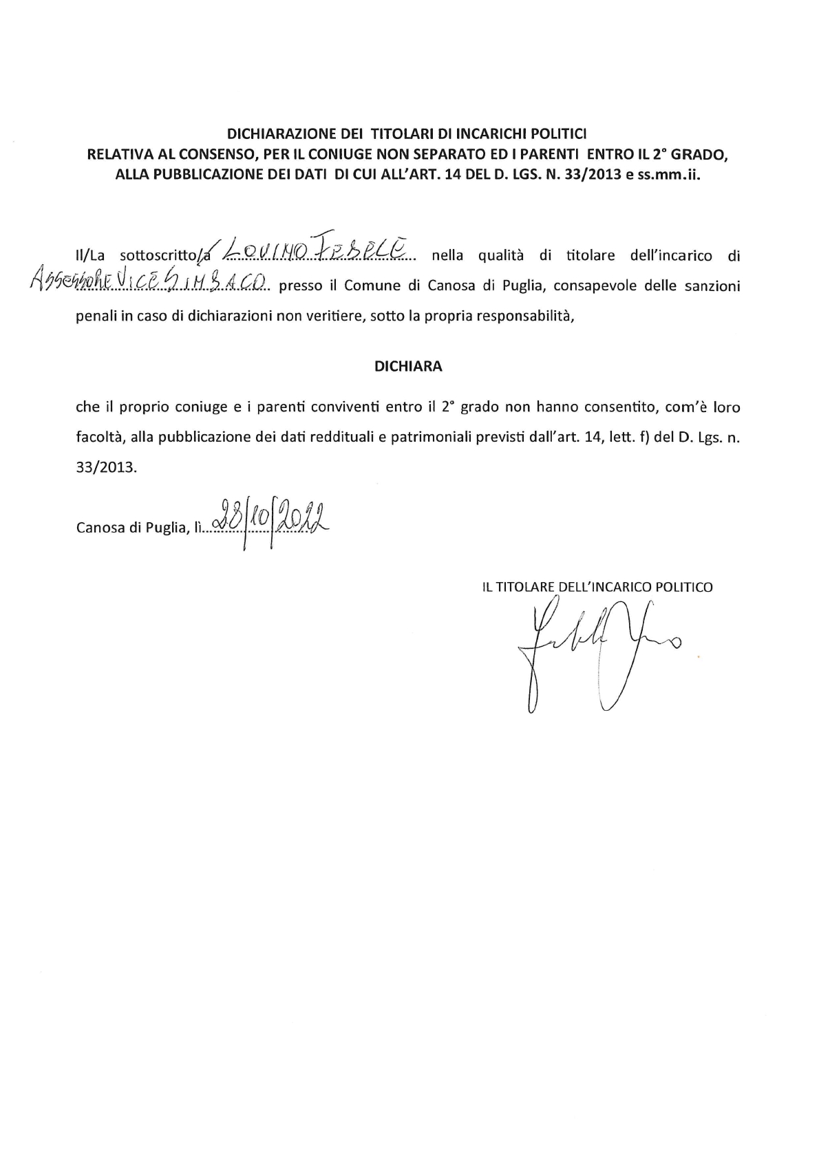 Copia ultima dichiarazione dei redditi delle persone fisiche - Sindaco e Assessori