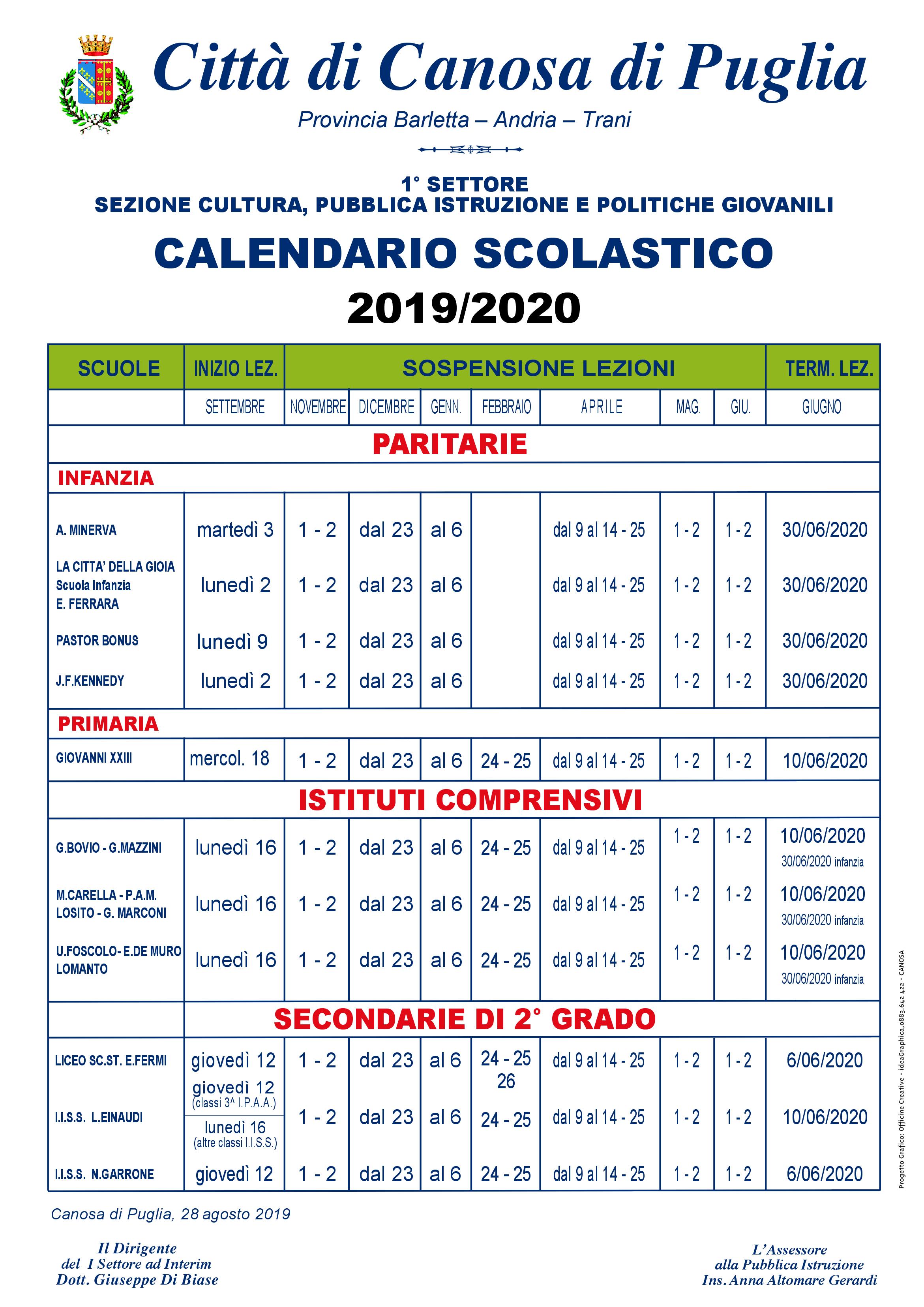 Le lezioni termineranno il 6 giugno per il Liceo “Fermi” ed il “Garrone” e il 10 giugno per tutti gli altri istituti scolastici ad eccezione delle paritarie dell'infanzia che termineranno le attività il 30 giugno.