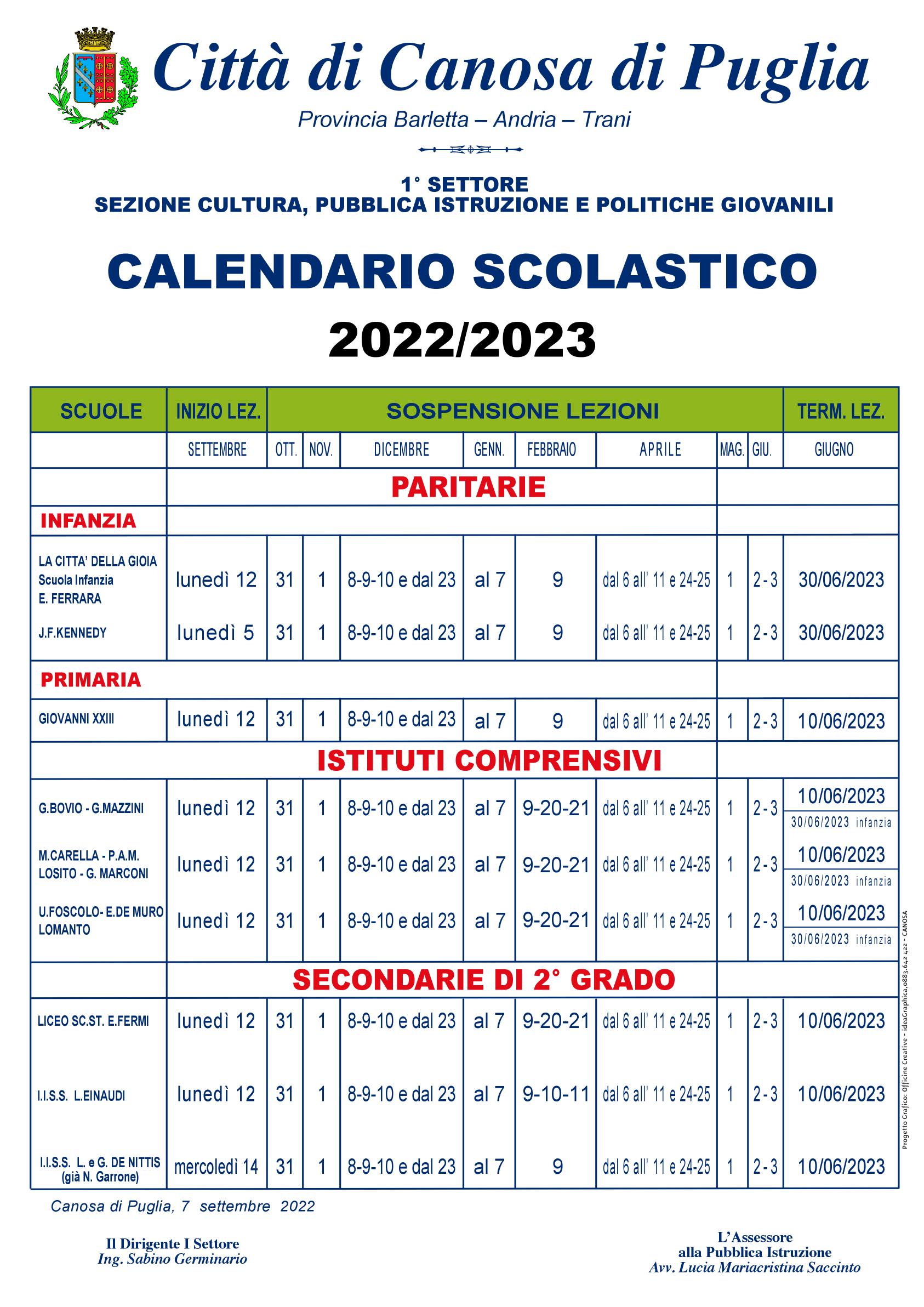 Con l’ufficializzazione del nuovo calendario scolastico, è conto alla rovescia per il rientro in classe degli alunni canosini. Partiamo dalle scuole paritarie dell’infanzia: già al via lunedì 5 settembre “Kennedy” mentre riaprirà lunedì 12 settembre sia “La Città della Gioia”, sia la paritaria primaria “Giovanni XXIII”.