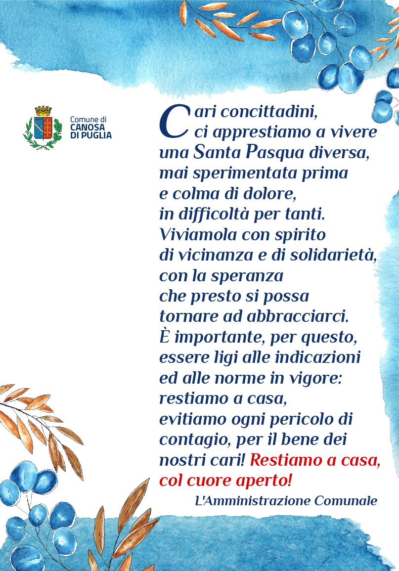 Il mio auspicio é che questo tragico momento finisca quanto prima e Canosa si ripopoli anche dei nostri cari concittadini che non sono potuti rientrare in città per trascorrere le festività pasquali e abbracciare i propri familiari.