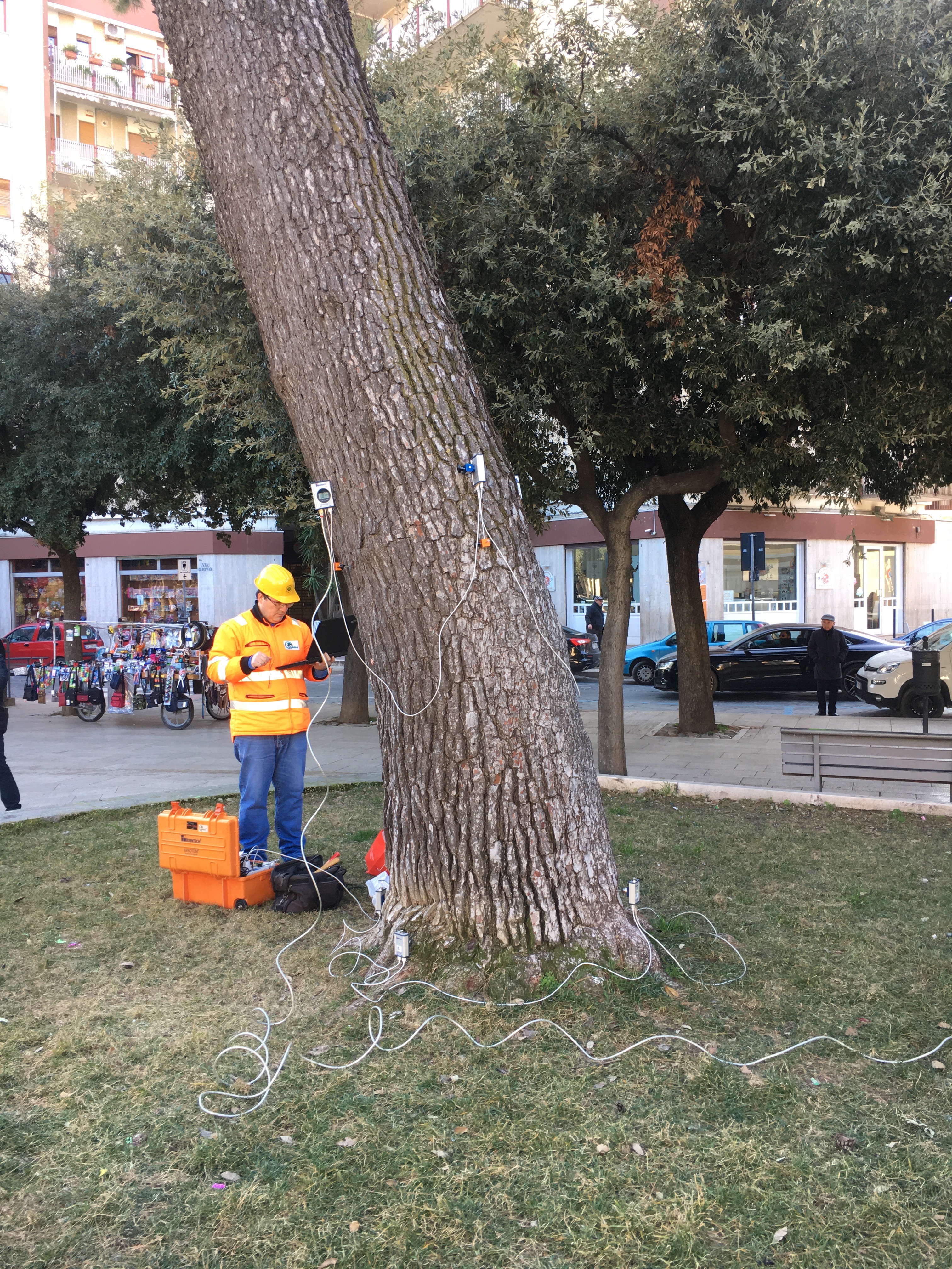 Questa mattina tecnici specializzati incaricati dal Comune stanno effettuando controlli con strumenti di altissima precisione ai due pini di Aleppo presenti nell'aiuola del Monumento ai Caduti. Tali controlli, effettuati in assoluta sicurezza e senza arrecare danno alle piante, sono necessari per valutare la stabilità dei due pini e per determinare gli eventuali interventi necessari (potatura ecc.) alla loro sicurezza. Da un primo esame effettuato dagli specialisti è emerso che i due alberi godono di ottima salute e servirà solo effettuare potatura mirata a ridurre l'effetto vela nelle giornate di vento.