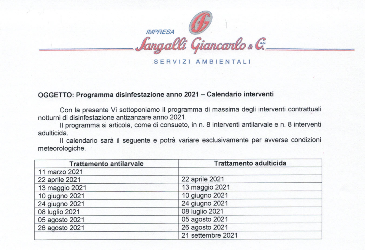 Si informano i cittadini che il giorno 24 giugno 2021, nelle ore notturne, verranno effettuati i trattamenti di disinfestazione adulticida mediante nebulizzazione di prodotto insetticida.
