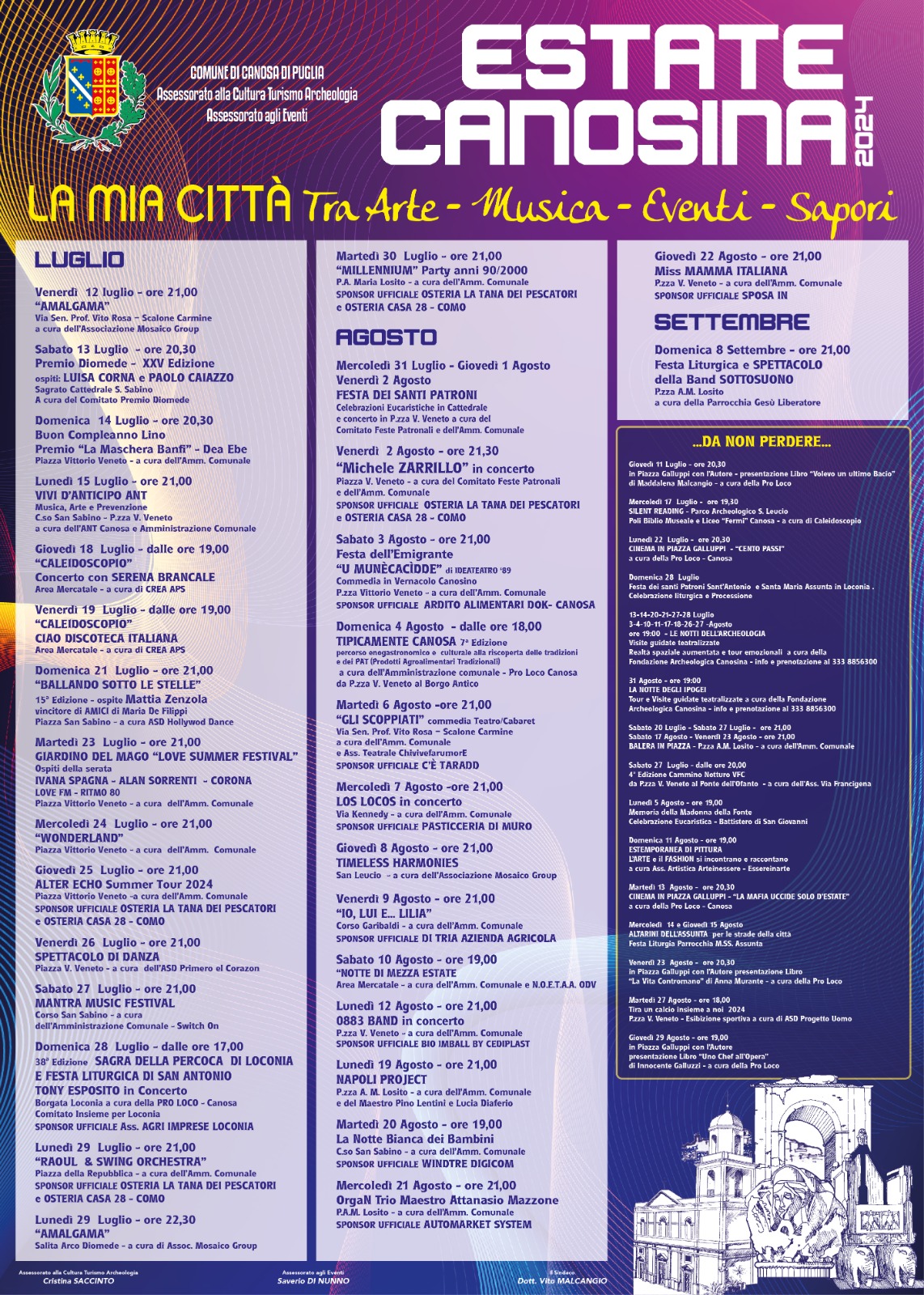 La rassegna prosegue con numerosi appuntamenti, dal “Mantra Music Festival” del 27 luglio a cura dell’associazione “Switch On”, all’Alter Echo Summer Tour 2024 e “Raoul Orchestra” del 25 e 29 luglio, fino a giungere a domenica 28 luglio e alla “Sagra della Percoca di Loconia” a cura della Pro Loco di Canosa e del “Comitato Insieme per Loconia” impreziosita da Tony Esposito in concerto. In occasione della Festa Patronale, ad allietare la serata conclusiva del 2 agosto, sarà Michele Zarrillo, noto cantautore vincitore del Festival di Sanremo 1987 nella categoria nuove proposte e fra gli artisti italiani con più partecipazioni alla kermesse sanremese. Autentica chicca di questa programmazione estiva sarà senz’ombra di dubbio la 7^ edizione di “Tipicamente Canosa”, un percorso enogastronomico e culturale alla riscoperta delle tradizioni locali per esaltare gusti e prelibatezze. Due le novità della manifestazione: la prima, la rimodulazione dell’itinerario che da Piazza Vittorio Veneto coinvolgerà Corso San Sabino, Piazza della Repubblica e come di consueto, l’intero Centro Storico. La seconda, i leitmotiv che la caratterizzeranno vale a dire i riconoscimenti a PAT, Prodotti Agroalimentari Tradizionali, della sfogliatella, degli strascinati di grano arso, del pane a prosciutto, della percoca e dell’olio extravergine cultivar coratina, ciascuno dei quali avrà uno spazio dedicato all’interno della manifestazione.