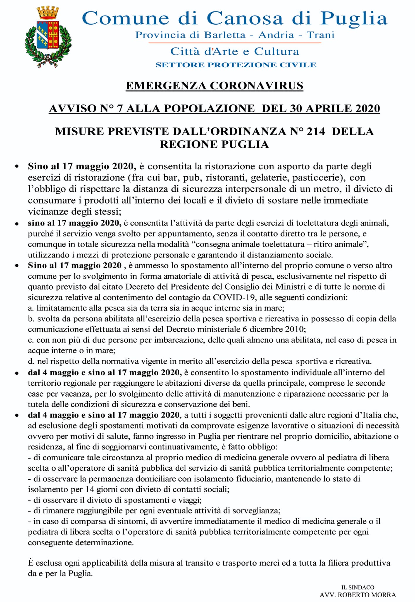 Coronavirus: D.P.C.M. 26 aprile 2020 e Ordinanza Regione Puglia n. 214